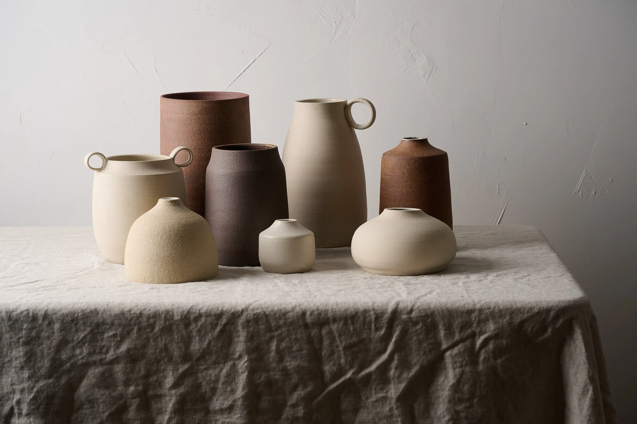For this special collaboration with Field Five Flowers, Kelly and Bethany developed a palette of rustic, earthy, and refined clay bodies that complement a range of aesthetics and florals. Each colorway in the collection is left unglazed on its exterior to showcase the raw clay body, and provide a matte backdrop for the florals to shine. Petrichor and Earth are fired in the gas reduction kiln, resulting in darker, textural, earthy vessels reminiscent of ancient clay pots. Salt and Dune are fired in an electric kiln to minimize surface texture, resulting in a refined and consistent lighter palette. Each and every piece is handmade from start to finish here in Missoula, Montana.